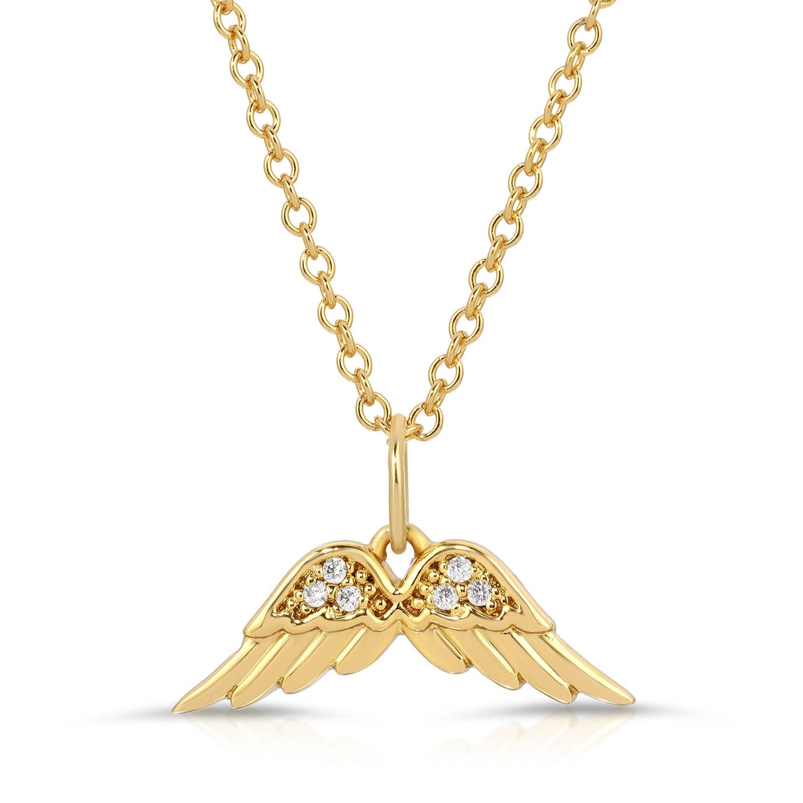 Keep your guardian angel close with this 14K gold plated brass necklace. The angel wing pendant with CZ settings sparkles with a sweet reminder that they're always by your side. Measures 16"-18".
