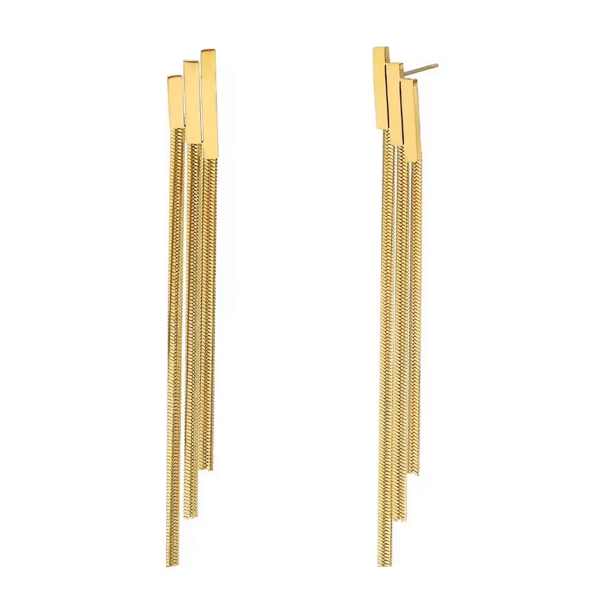 Introducing Bebe, the perfect accessory to spice up your wardrobe. These snake chain tassel earrings are a must-have for any fashion-forward individual. Plated in 18K Gold on durable Stainless Steel, they're not just earrings - they're a statement.