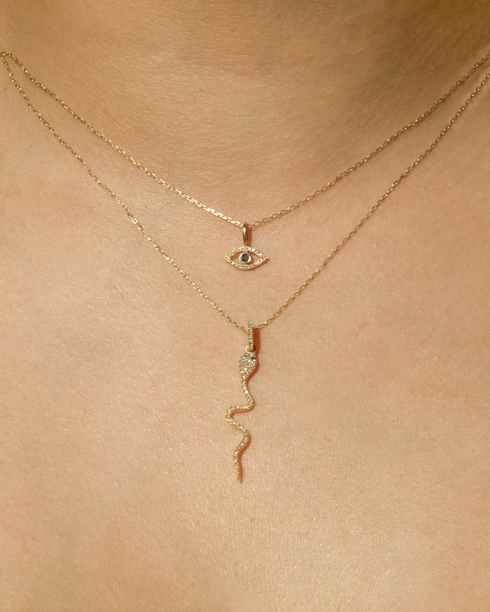 Turn heads and ward off bad vibes with this 14k gold evil eye necklace—a bold statement piece that pairs a striking sapphire with sparkling diamonds. Unapologetically glamorous, it's the talisman for anyone who refuses to dim their shine.