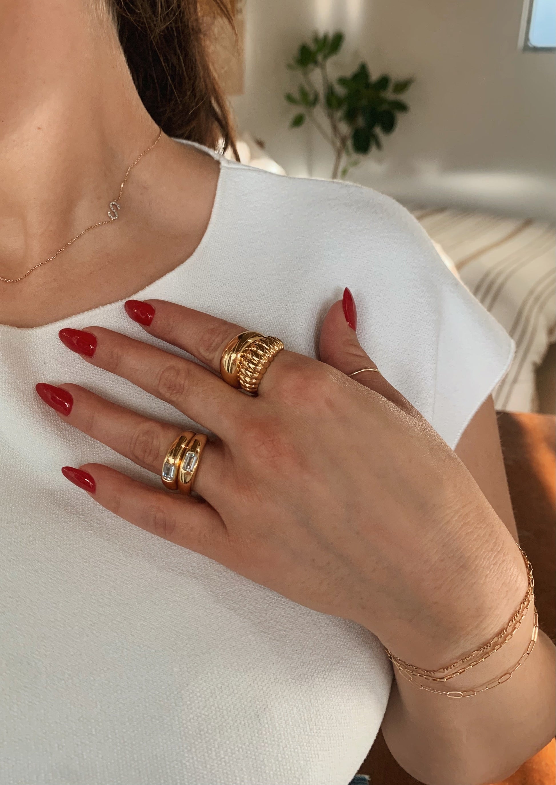 Band with emerald cut CZ accent; 14K Gold plated Brass.