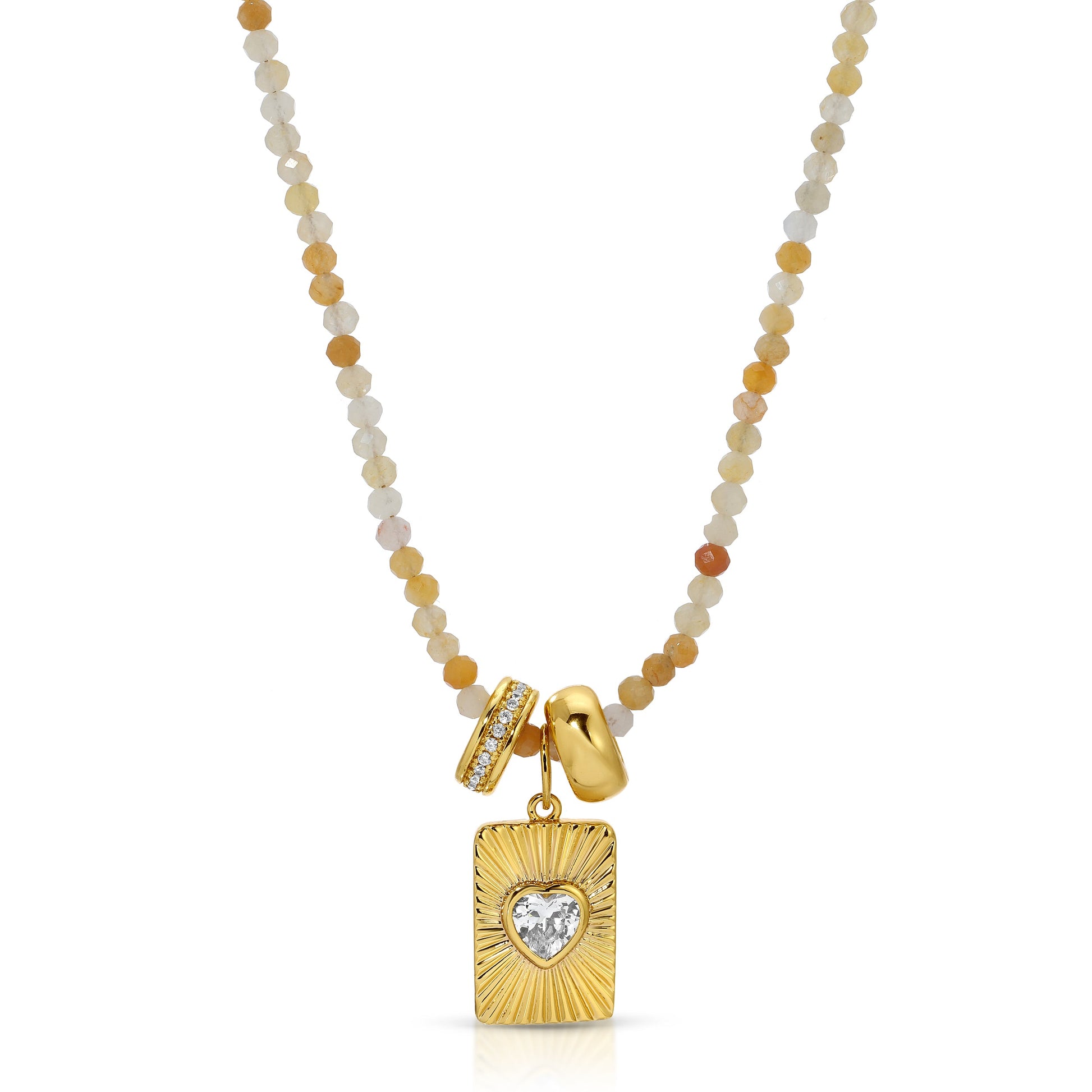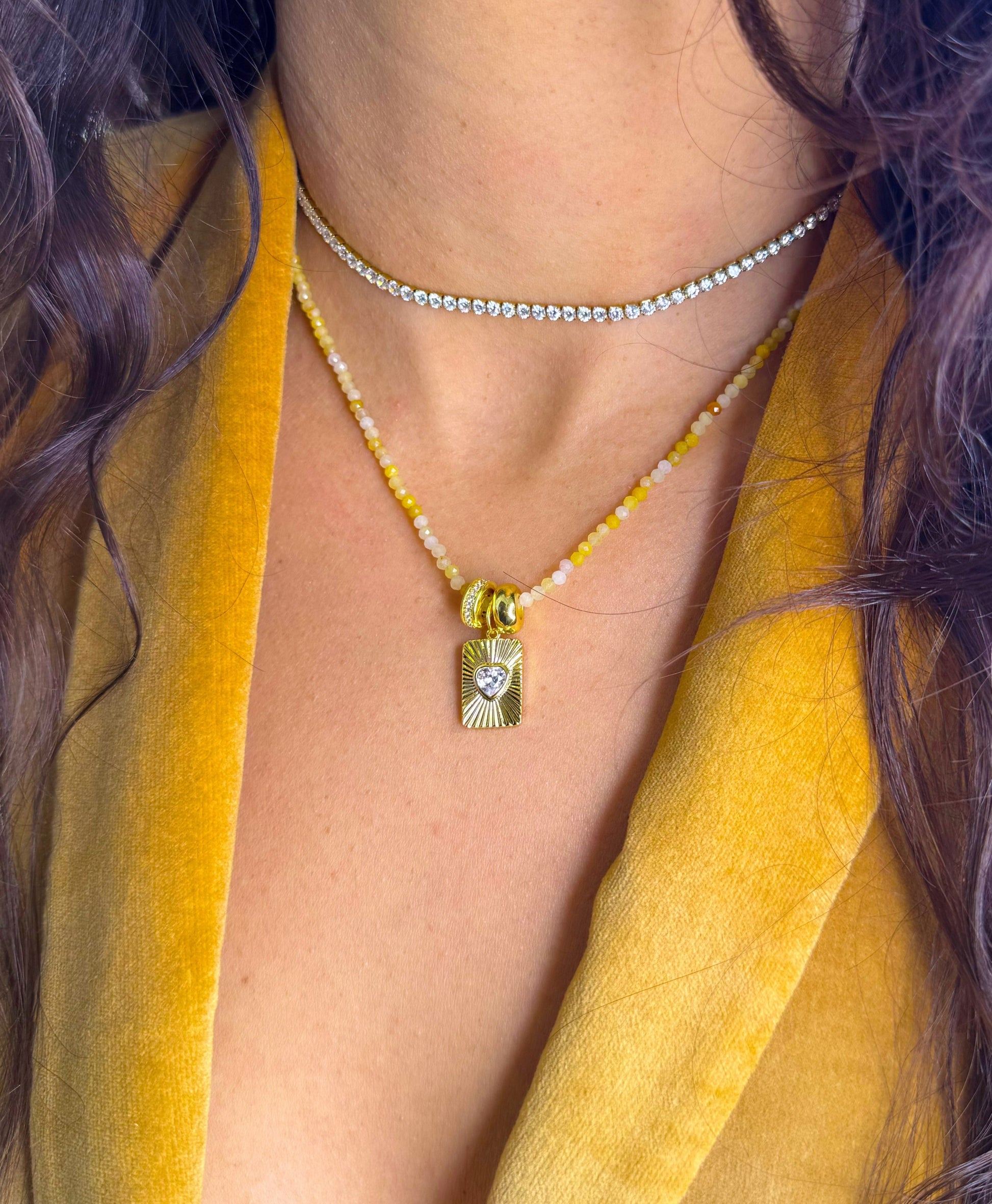 Spread positivity and confidence with every beat of your heart. Slip on our Heart Beam necklace, featuring our signature Sidekick Yellow Jade necklace, our Stuck on You charm, our Sleek Charm Spacer, and our Spark Charm Spacer.