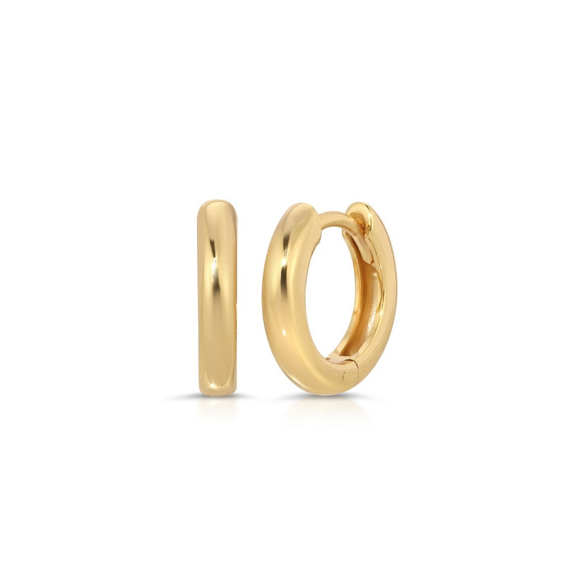 Go ahead and add some extra flair to your ear game with our sleek solid gold huggie hoops, perfect for wearing solo or stacking with your other faves.