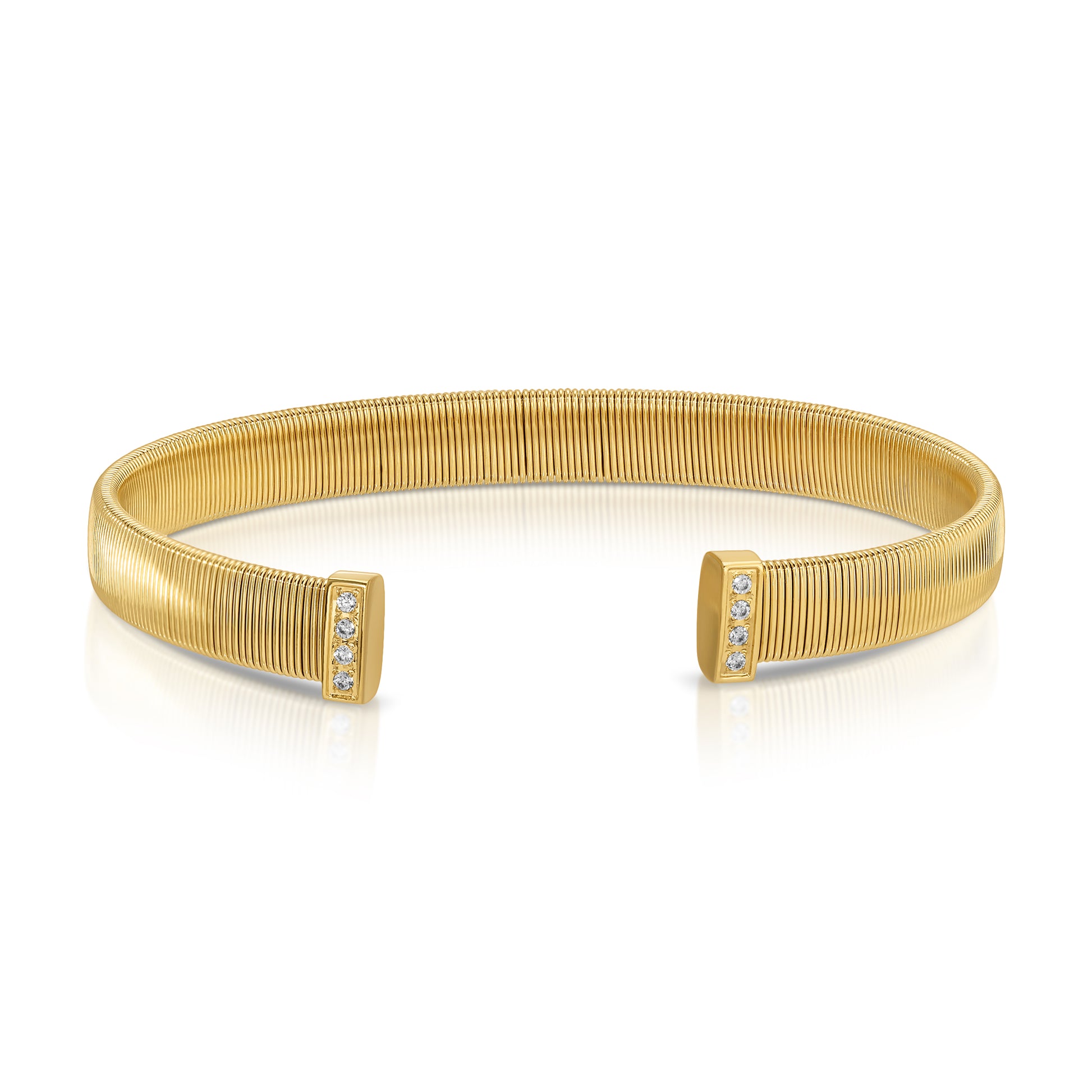 Slip on this gold cuff bracelet with its eye-catching simulated diamond end caps and let your wrist do the talking.