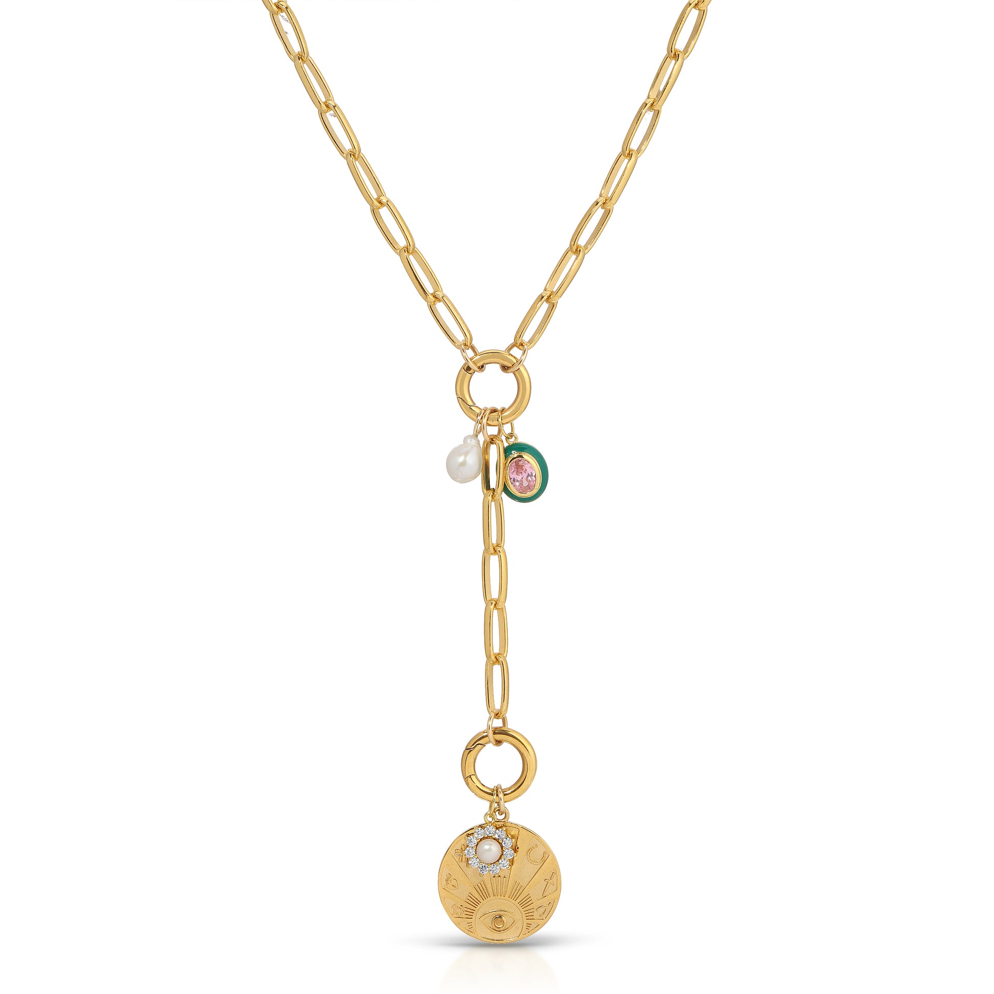 Own your vibe with this charm chain necklace that's anything but basic. Layer on the style with our Lucky AF coin, Luster Pearl Burst Charm, Adorn Pink Spinel Charm, Precious Pearl Charm.